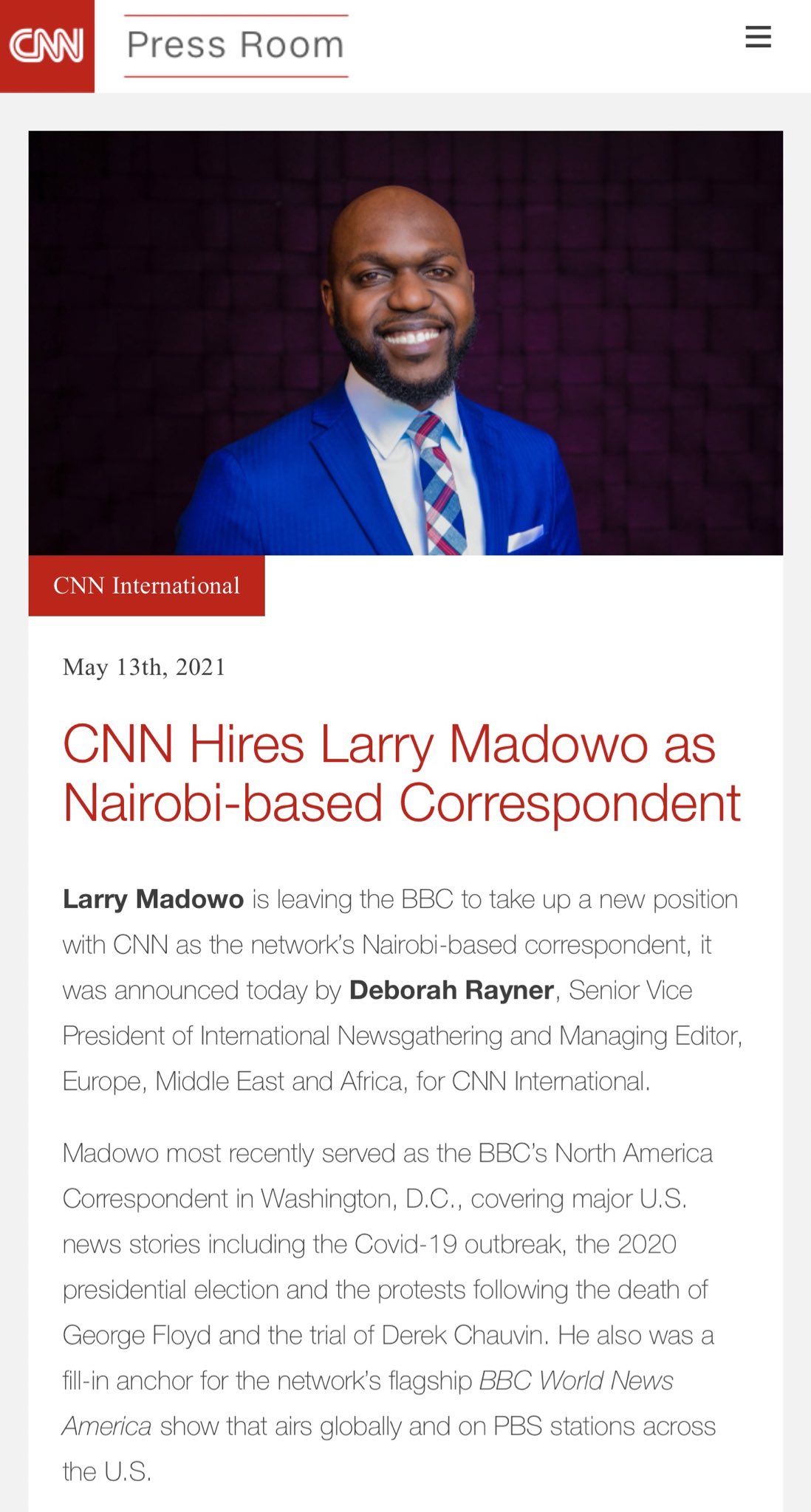 Madowo most recently served as the bbc's … He had his primary education at usingo and karapul primary schools, after which he enrolled at the st gabriel's seminary. And around the world, but notes it's a privilege to return to covering africa at such a critical time in kenya and around the continent. The announcement was made on thursday by deborah rayner, senior vice president of international newsgathering and managing editor, europe, middle east and africa, for cnn international. Larry madowo was born in kenya on tuesday, july 14, 1987 (millennials generation). When he started his career, larry madowo realized that the rat race is a rat eat rat scenario. Larry madowo (born 14 july 1987) is a kenyan journalist who is a north america correspondent for the bbc. He is unmarried to her girlfriend's name not mentioned on this page. Larry madowo biography and educational background larry madowo was born on the 14th of july, 1987 in siaya, kenya. Senior vice president of international newsgathering and managing editor, europe, middle east, and africa, for cnn international, deborah rayner, made the announcement today via a press release. This was announced today by deborah rayner, senior vice president of international newsgathering and managing editor, europe, middle east and africa, for cnn international. Larrys is well known for his masters degree in sarcasm and unsatisfactory responses from the university of everybody normally trending on social media because of this larry madowo biography /life history About i'm a north america correspondent for bbc world news based in washington, dc.